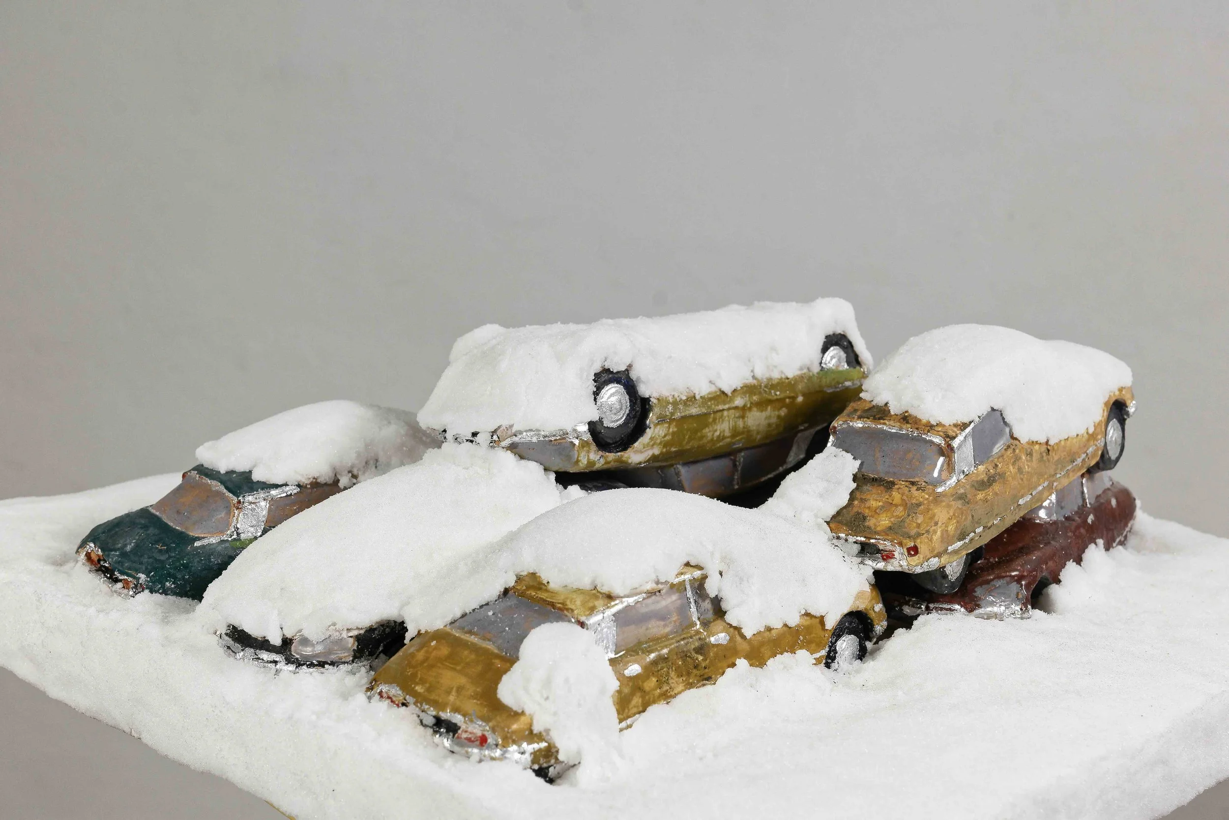 Francesco Finotti, “Snow on cars”, 2025, ceramica, foglia argento, resina all’acqua, 14x40x43cm